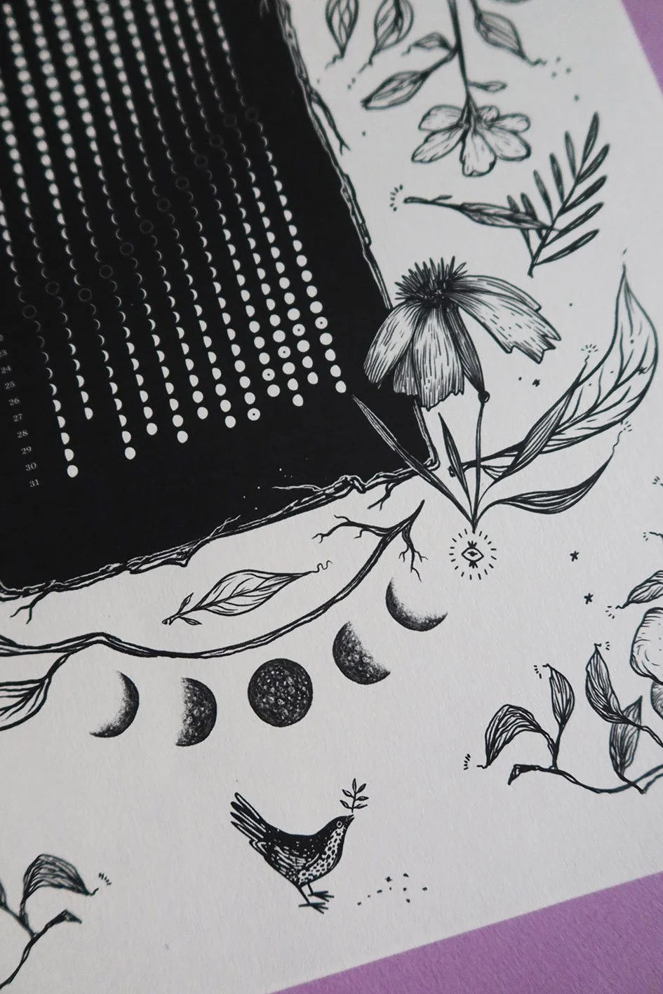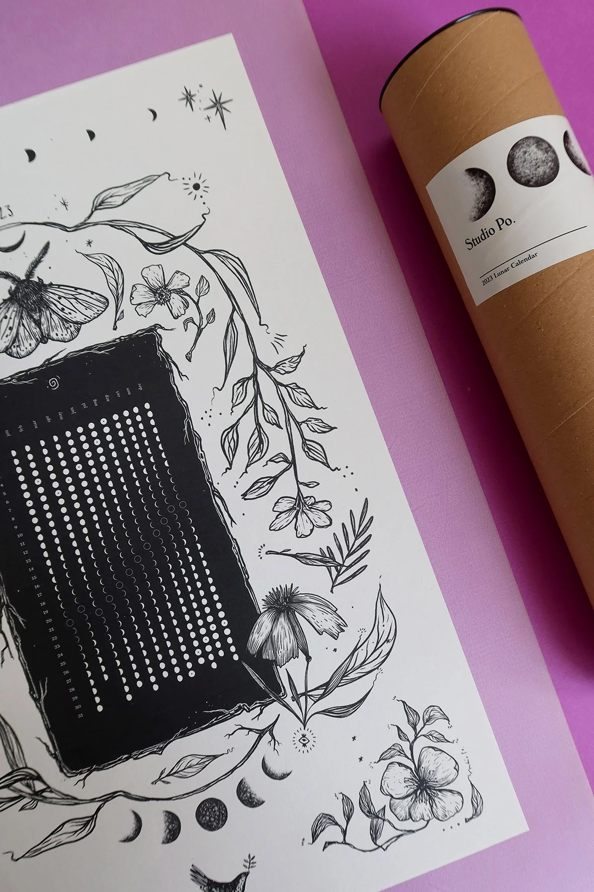 Lunar Calendar ‘23 2023 Lunar Calendar to track all the daily moon phases.33*48 cm 120 gr. straw paper. Black&white print.